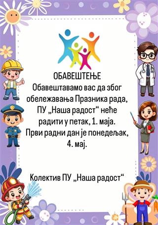 08.04.2026. Поштовани родитељи, Обавештавамо Вас да, поводом предстојећих васкршњих празника, установа неће радити... опширније...