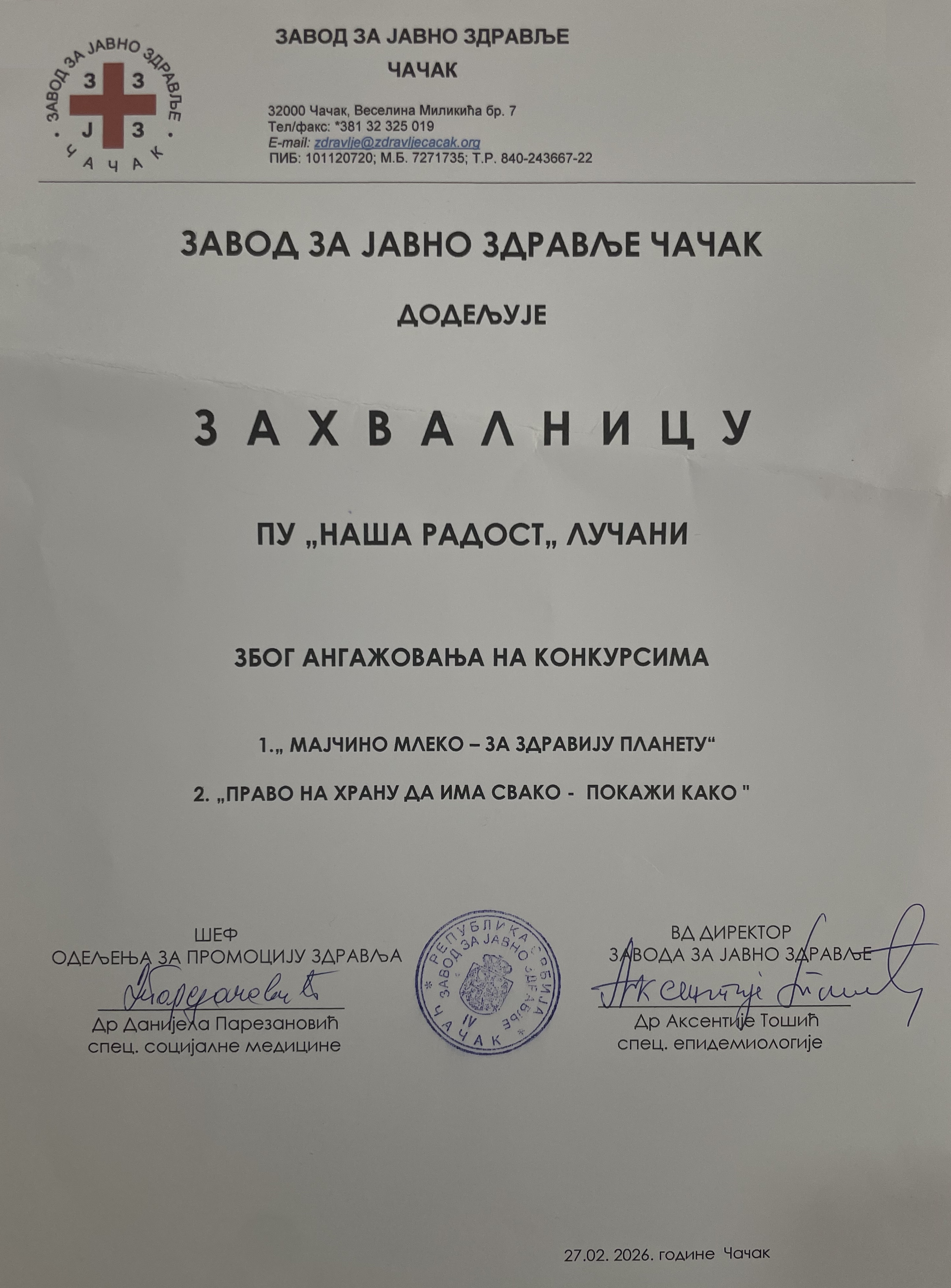 Захвалницу можете погледати овде.